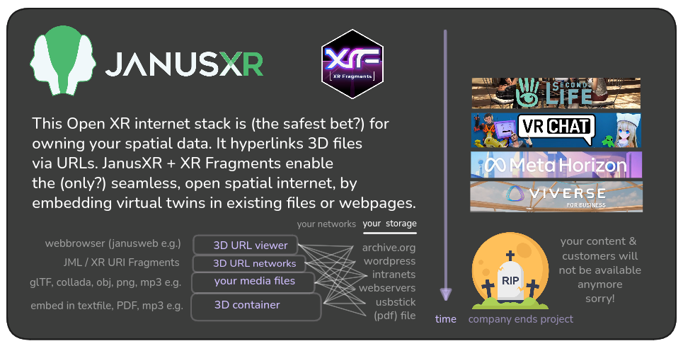 We encourage XR translator-development to view existing ecosystems like the 2D web, or file-collections within AR/VR-headsets via open protocols 🔌 : RSS, HTML, JML, Fediverse's ActivityPub and URI's using XR Fragments e.g.