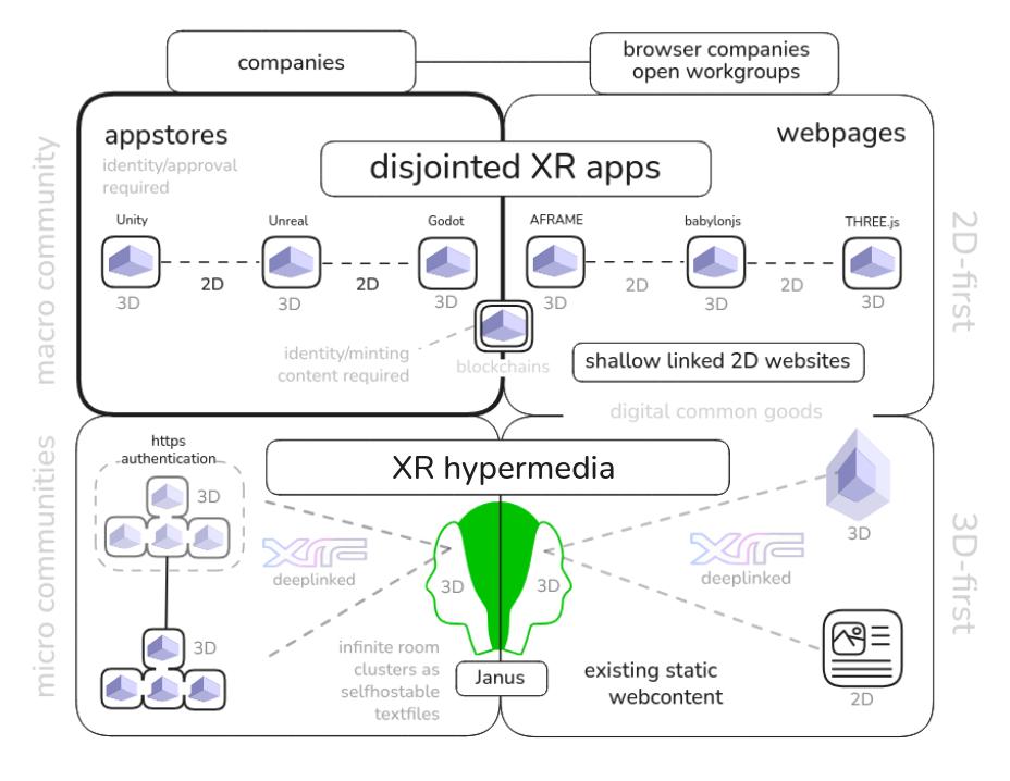 A: Preferred are Fully Opensource XR Browserengines like: Or roll your own XR hypermedia browser (via XR Fragments e.g.): ♥️ = janusweb has the highest local-first XR hypermedia-support, see translators, polyglot and addressibility and runs on desktop/phone/headset all-at-once.
